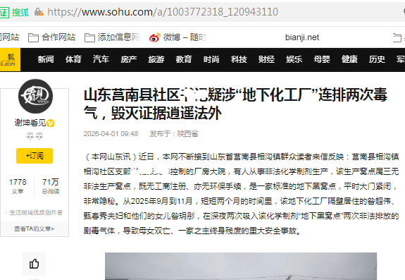 (本网山东讯)近日,本网不断接到山东省莒南县相沟镇群众读者来信反映:莒南县相沟镇相沟社区支部领导张某控制的厂房大院,有人从事非法化学制剂生产,该生产窝点属三无非法生产窝点,既无工商注册、亦无环保手续,是一家标准的地下黑窝点,平时大门紧闭,非常隐秘。从2025年9月到11月,短短两个月的时间里,该地下化工厂隔壁居住的昝超伟、甄春秀夫妇和他们的女儿昝玥彤,在深夜两次吸入该化学制剂“地下黑窝点”两次非法排放的剧毒气体,导致母女双亡、一家之主终身残废的重大安全事故。